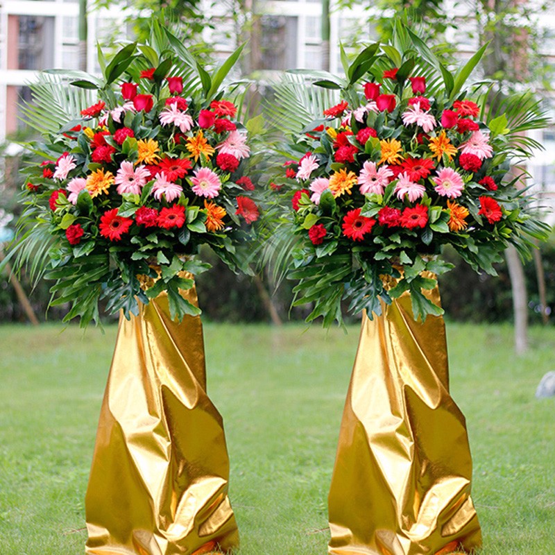 花材: 各色弗朗,康乃馨,玫瑰混搭共36只,搭配适量富贵竹、散尾葵。一层花架一个,金箔纸包裹。