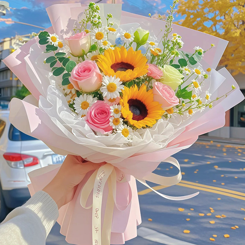 【光芒万丈】精选2支向日葵,5支戴安娜粉玫瑰,1支洋桔梗,搭配洋甘菊、尤加利叶装饰。