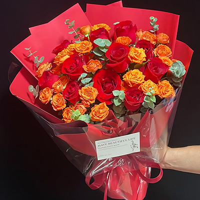 【爱你爱恋】11枝红玫瑰,6枝多头橙芭比,搭配尤加利叶装饰。