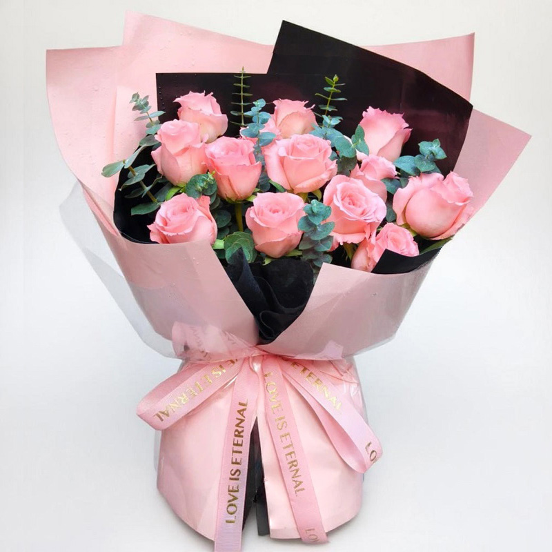 【温香软玉】12朵粉玫瑰,搭配尤加利叶装饰。
