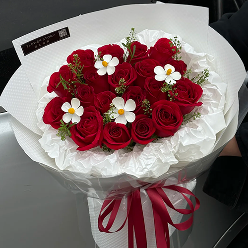 【爱你永恒】33朵精品红玫瑰,2支多头白色香水百合,搭配白色满天星丰满间插。