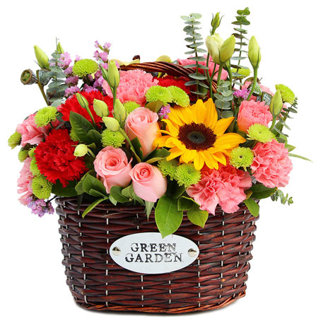 【灿烂未来】12支粉色康乃馨+7支红色康乃馨+6支粉玫瑰+1支向日葵,搭配适量浅绿色桔梗、绿色小雏菊、勿忘我、尤加利、栀子叶。