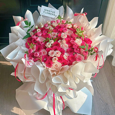 【百花深处】33朵红玫瑰与粉玫瑰混搭(各占一半),搭配白色满天星、尤加利叶装饰。