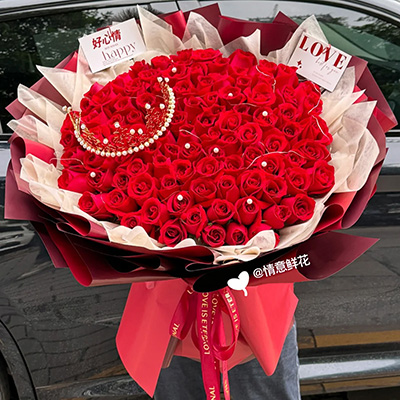 【玫瑰花开】精选99朵红色玫瑰花,1条灯带,1个皇冠,满天星外围环绕。