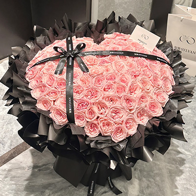 【袅袅爱意】精选99朵红色、粉色玫瑰,其中66朵粉荔枝玫瑰,33朵弗洛伊德红玫瑰,白色缎带装饰花面。