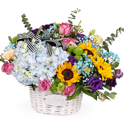 【夏日花园】9支精品紫玫瑰、1支蓝色绣球、3支向日葵、4支多头紫色洋桔梗、2支香槟色洋桔梗,搭配蓝色满天星、绿色小雏菊、尤加利叶,一朵蝴蝶结装饰花面。
