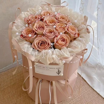 【满眼星河】精选11枝卡布奇诺玫瑰,珠串装饰花面花体,5支同色系蝴蝶结围绕包装装饰,白色纸内衬,同色系小香风包装,珠串和同色系缎带花结。