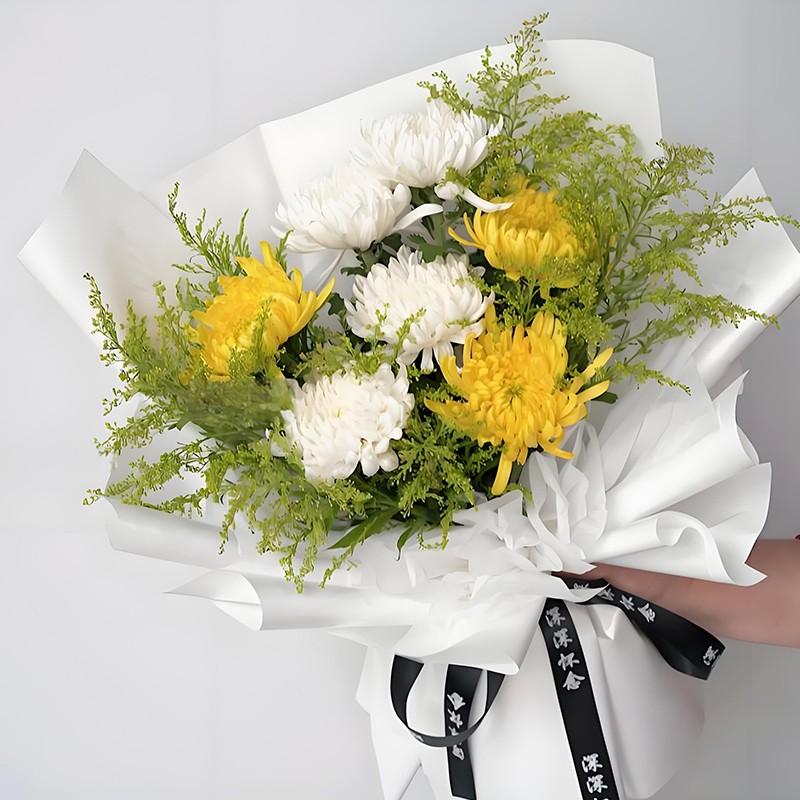 【追忆】9朵白菊花,11朵黄菊花,1枝多头黄百合,散尾葵、绿叶搭配。
