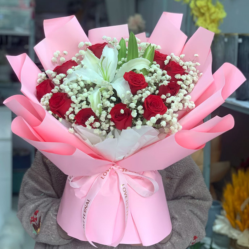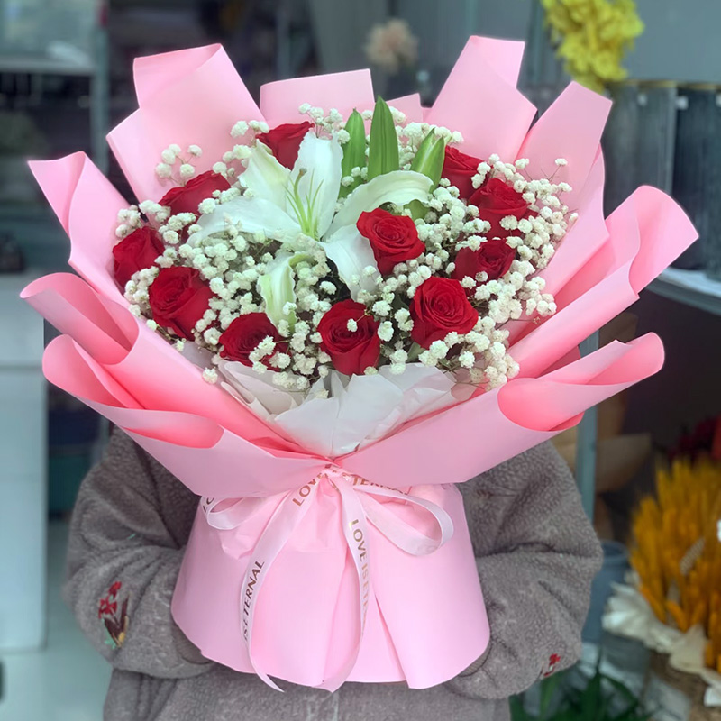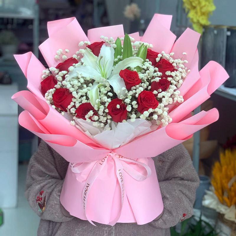 花材: 精选11朵红玫瑰,1支多头白色香水百合,搭配尤加利叶、满天星丰满装饰。