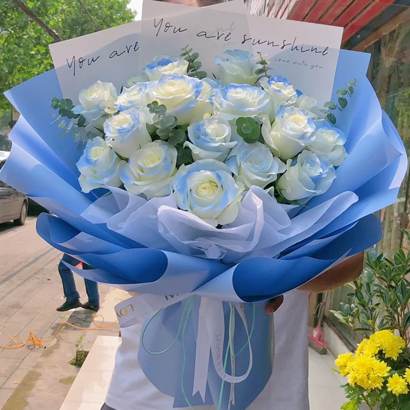 花材: 19朵碎冰蓝玫瑰,尤加利叶间插装饰。