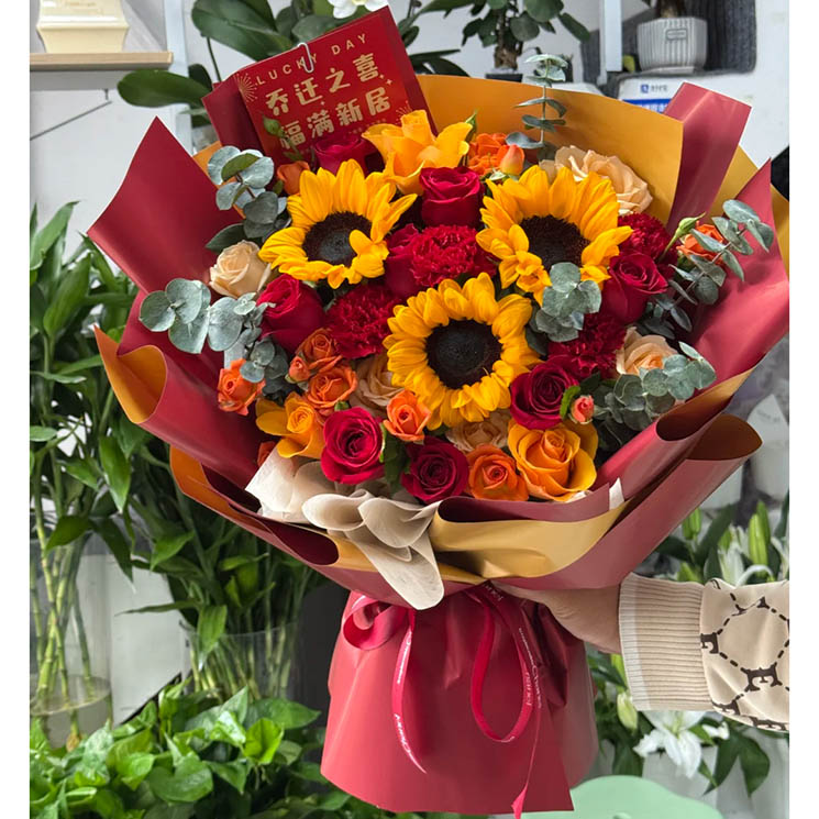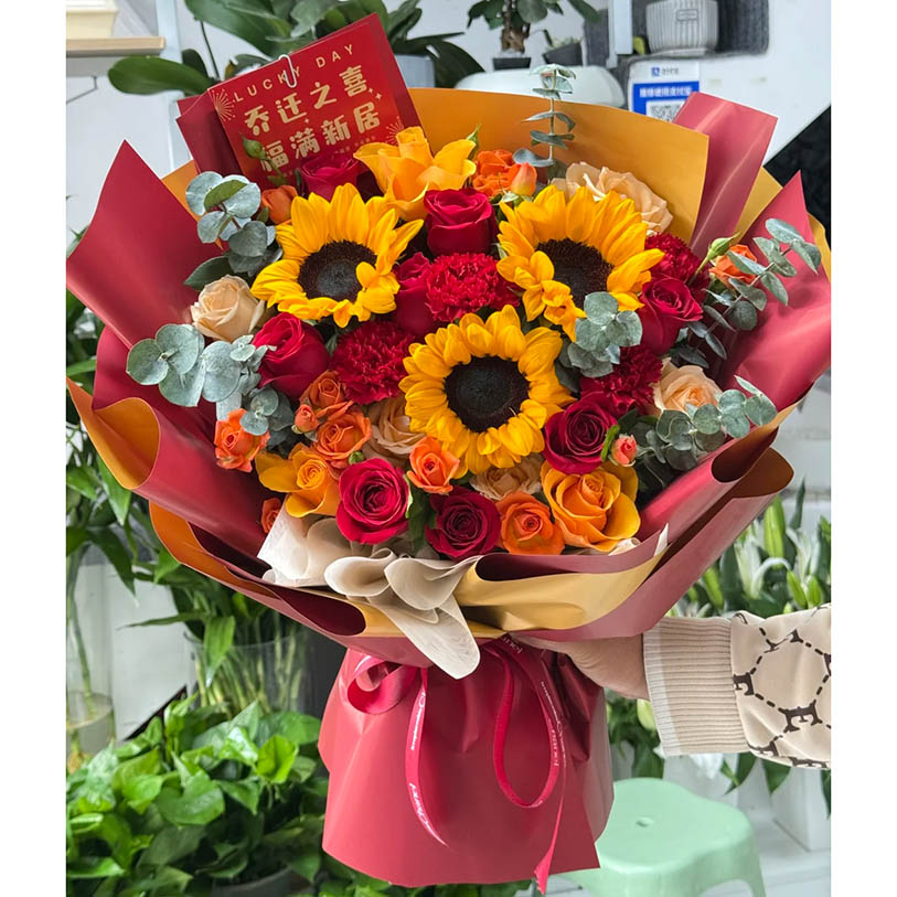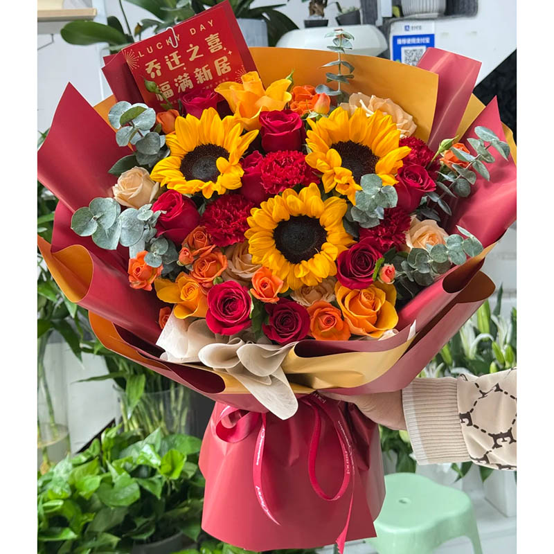 花 材:精选3枝向日葵,19朵玫瑰康乃馨混搭(红玫瑰和红色康乃馨为主,金辉玫瑰、香槟玫瑰),5枝多头橙色泡泡,搭配尤加利叶装饰。