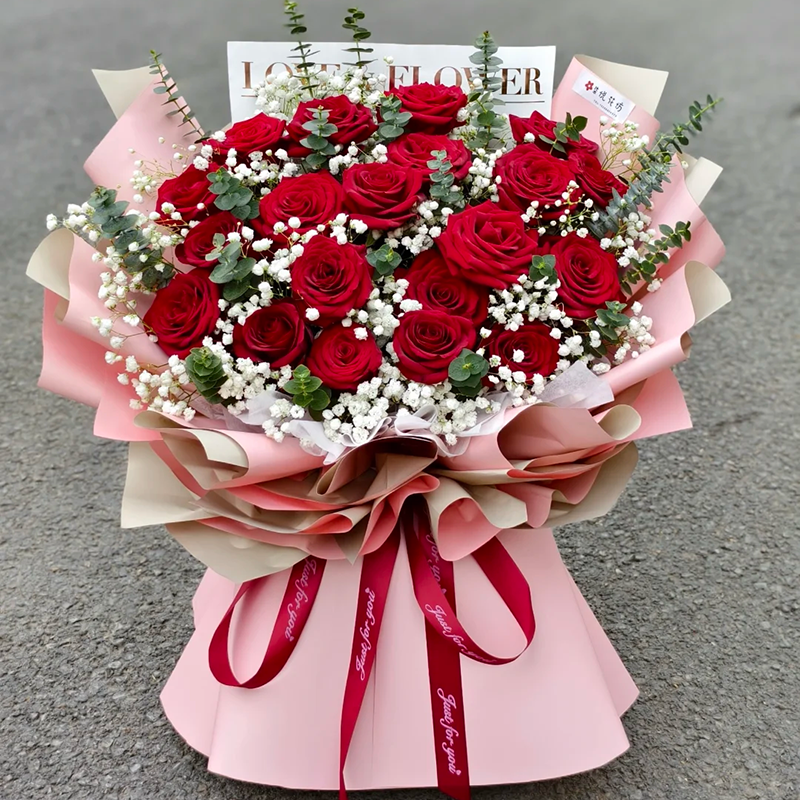 花 材:精选20枝红玫瑰,搭配尤加利叶、白色满天星装饰。