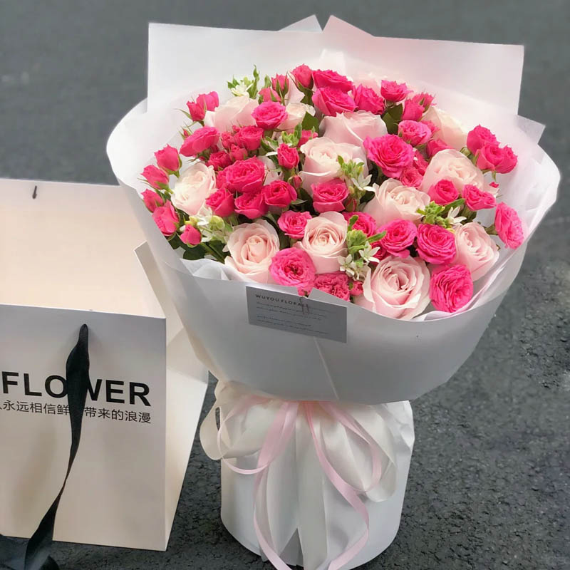 包 装:白色雪梨纸内衬,白色韩素纸外包,粉色/白色花结。