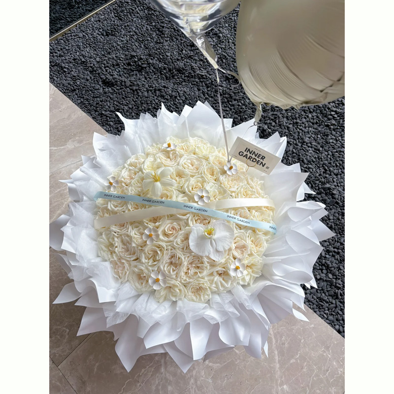 花材: 52支白荔枝玫瑰,1朵白色蝴蝶兰,1支白色郁金香,7支干花紫罗兰,2个气球,1条丝带装饰花面。白色纸多层包装。