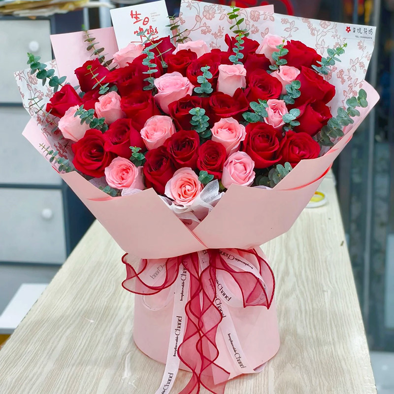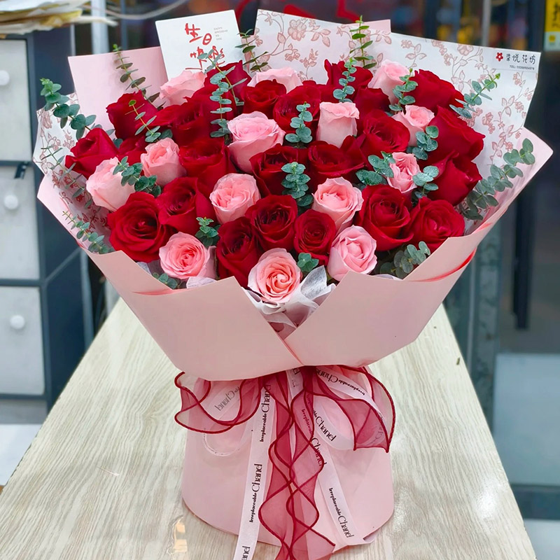 花材: 36朵红玫瑰、粉玫瑰混搭,尤加利叶装饰。
