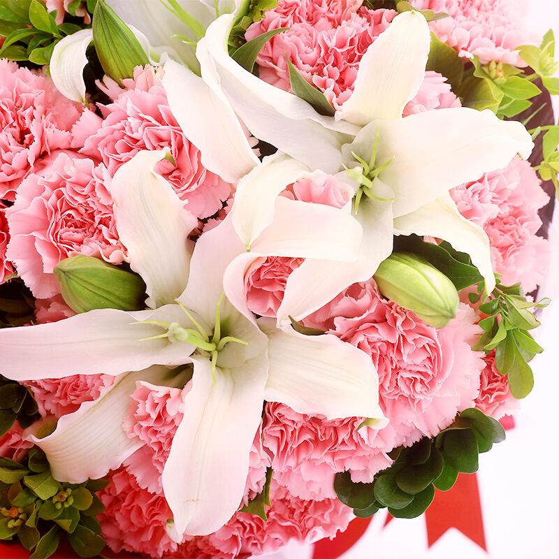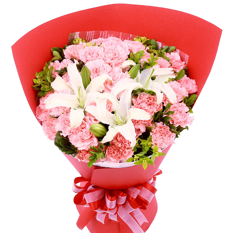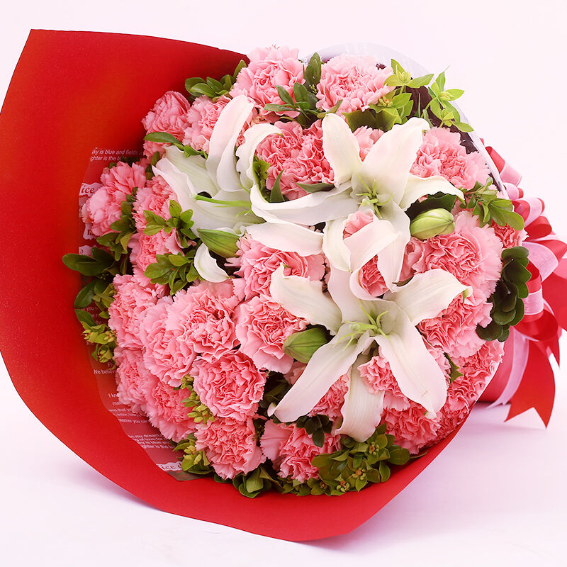 花材: 19支粉色康乃馨+2支多头白百合,搭配适量叶上黄金。