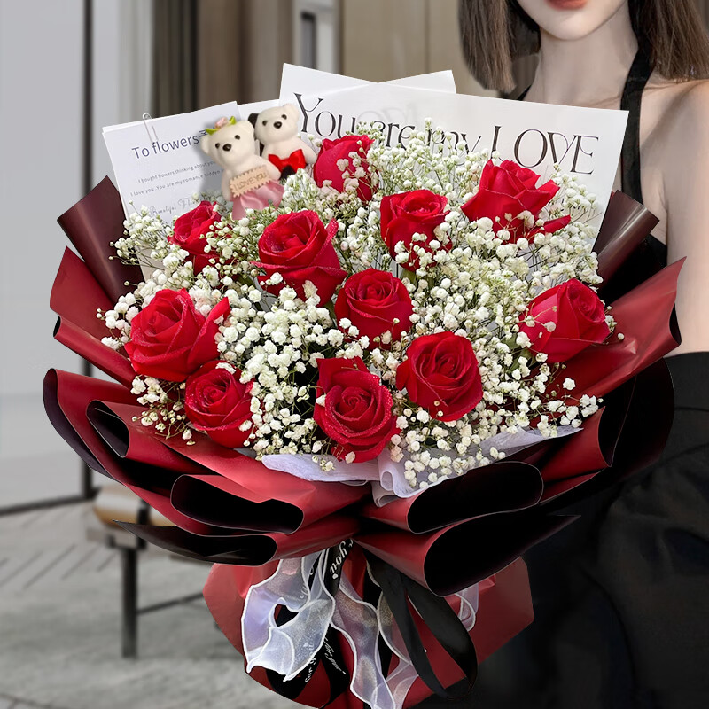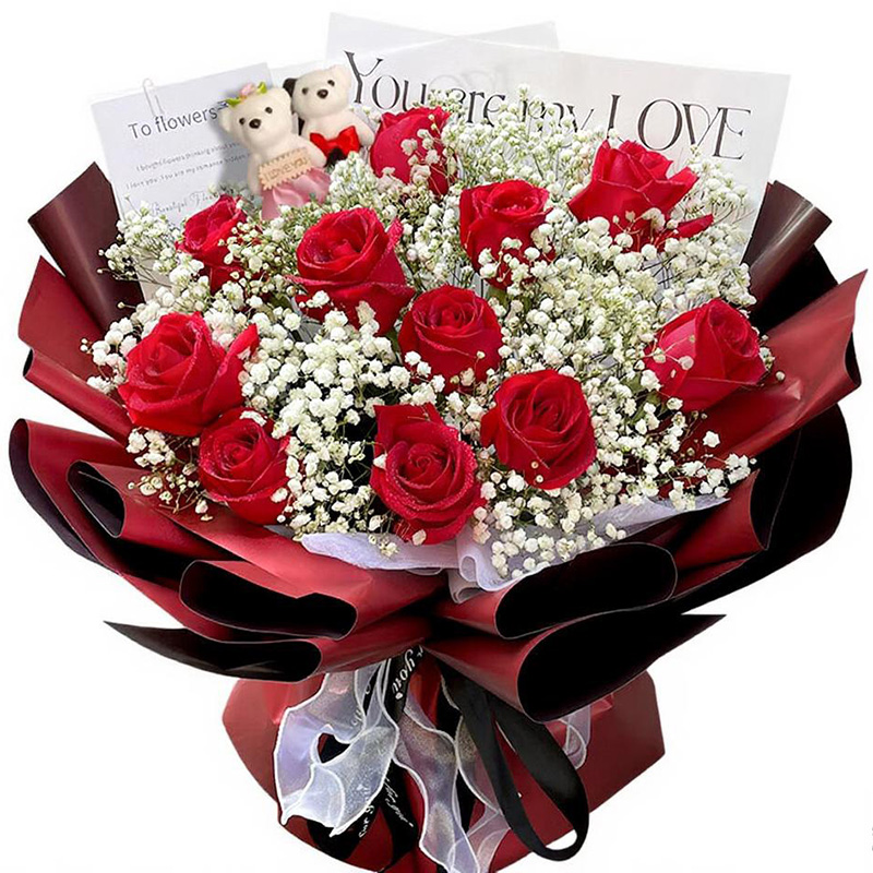 花 材:精选11朵红玫瑰,2支可爱小公仔(款式随机),搭配满天星装饰。