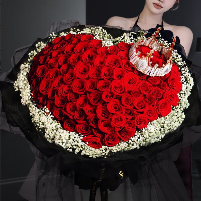 花材: 99支顶级红玫瑰心形造型,1个皇冠(款式随机),满天星环绕。