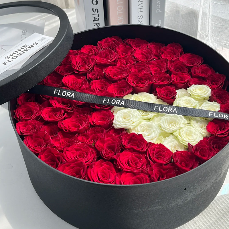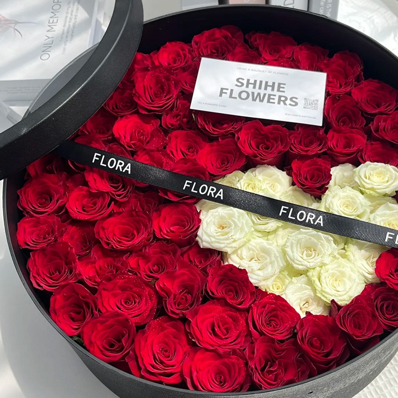 花材: 精选60枝红玫瑰,15枝白玫瑰(白玫瑰心形造型),一条缎带装饰花面。