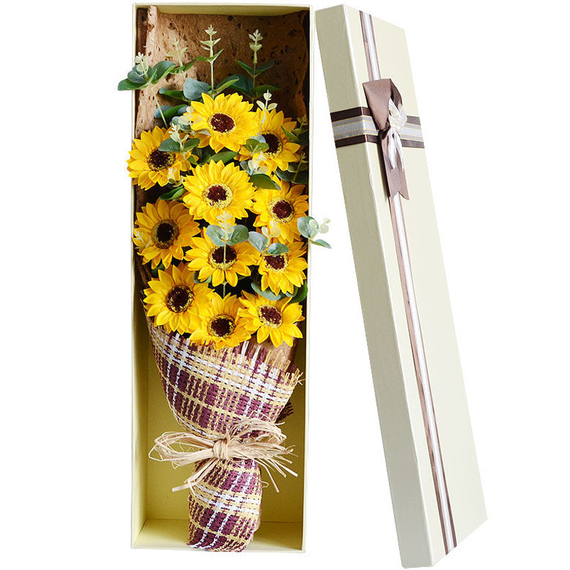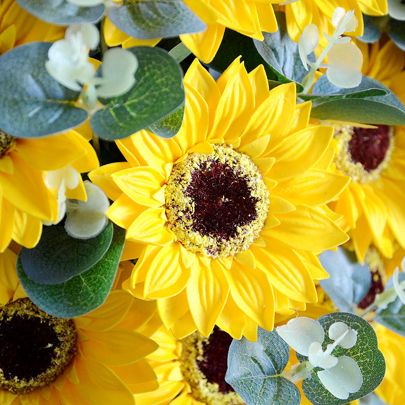 花 材:精选11支向日葵,搭配尤加利叶装饰。